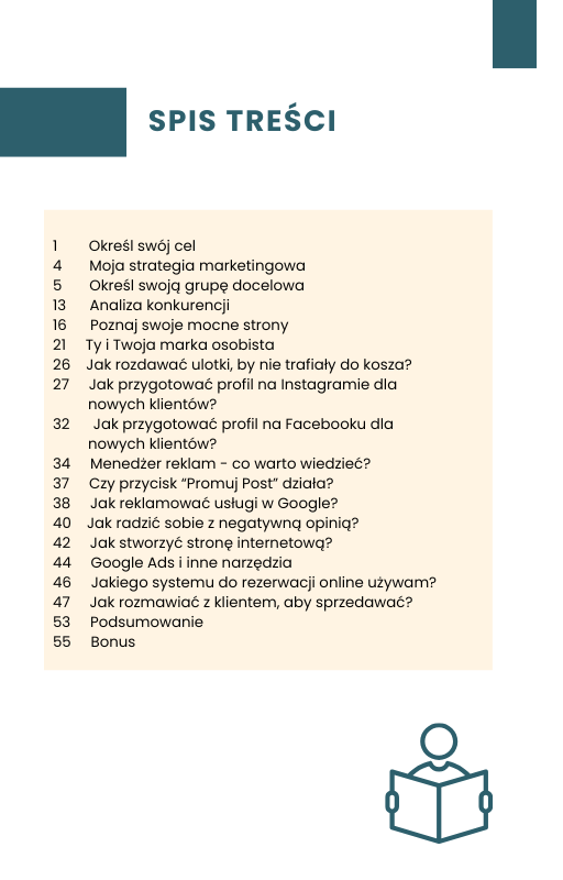 Jeśli nie wiesz, jak reklamować swoje usługi, a chcesz pozyskać więcej klientów, ten kurs jest stworzony specjalnie dla Ciebie! To ponad 60 stron sprawdzonych, praktycznych informacji, popartych moim 8-letnim doświadczeniem w branży. Wszystko, co przekazuję, przetestowałam na własnej skórze, wdrażałam w swoim biznesie, a teraz dzielę się tym z Tobą.
